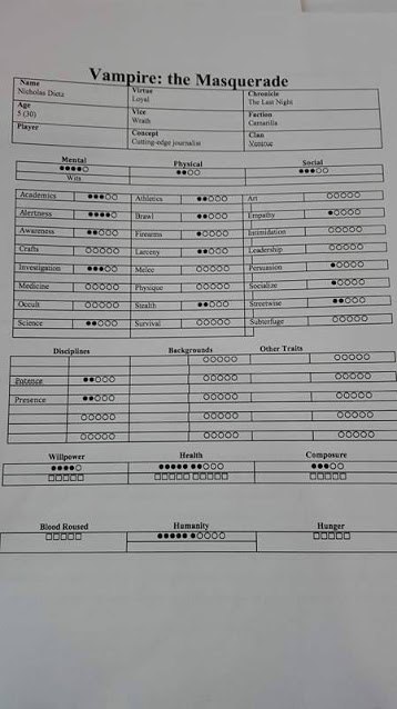 The "big thing" that it seemed like this was a testbed for is the Hunger system as a replacement for Blood Points. The basic idea is that rather than decreasing the amount of blood you have you increase the amount of hunger you have. Rather than spending Blood Points you instead "Rouse the Blood" to accomplish a variety of things (basically all the same things you spend blood for under the current rules). A few subtle but important inclusions are that you must Rouse the Blood to awaken each night, any vampire must Rouse in order to not appear dead, and all uses of Disciplines require Rousing. You keep track of how many times you Rouse the Blood in a scene and at the end of that scene you roll that many dice. Any dice that don't roll a success add to your Hunger (a scale of 1-5). Any time you make a skill roll or skill-based Discipline roll you have a number of dice in your pool replaced by "Hunger dice," equal to your Hunger rating. These dice function like normal dice and can contribute successes, but if any of them roll a 1 you gain a temporary Compulsion from your Beast (note that 1s do not subtract from successes in these rules so you aren't getting double-whammied or anything). Compulsions are tics of your predatory vampiric nature that can vary in severity depending on the number of Hunger dice that rolled a 1. In the game I ran a Toreador was overwhelmed with strong emotion for someone in the scene, a Ventrue felt compelled to assert his dominance and leadership over the group, and another Ventrue felt incredible anxiety at the lack of order and structure they had without guidance from their superiors. These were all pretty minor Compulsions and we didn't have anyone fail badly enough to pull one of the nastier ones (though one character was walking around with 4 Hunger for a bit).